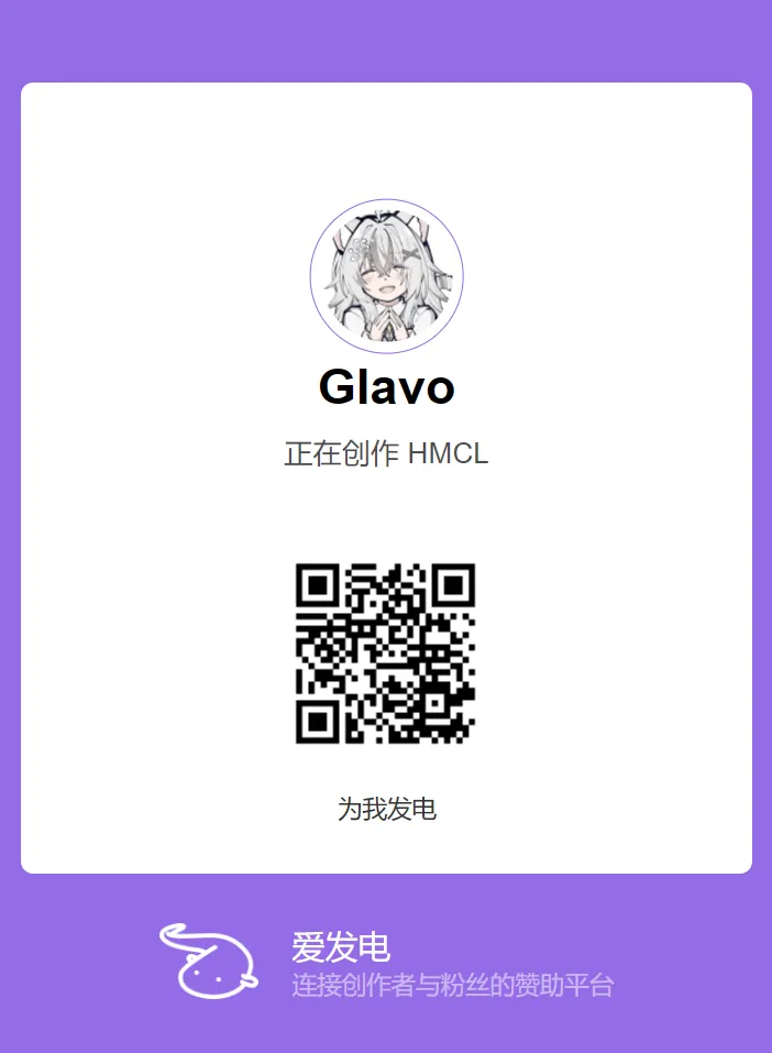 捐赠支持 Glavo如果你喜欢我的工作,并且希望支持我继续开发和维护开源项目,可以通过以下方式进行捐赠:通过爱发电捐赠:Glavo - 爱发电在 Bilibili 上充电支持:Glavo - Bilibili在 Bilibili 直播间打赏:Glavo 的直播间通过微信赞赏:Glavo 的赞赏码扫码赞赏微信赞赏爱发电